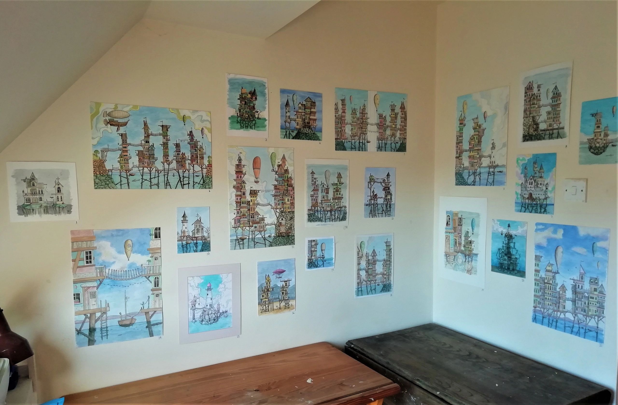 In lieu of an actual exhibition I was supposed to have during the first Irish Covid-19 lockdown, I held an online virtual exhibition of all my stilt town pieces. It was incredibly successful, selling 80% of what was for sale. All pieces can be viewed on my Gallery page, under Illustrations.