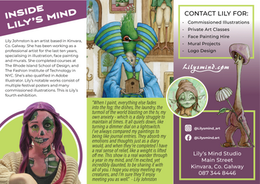 Lily grew up in Connecticut, spending each summer in Kinvara with her sister and parents, who ran a hostel on Main St. Since calling Kinvara her permanent home for the last 5 years, Lily has fully immersed herself in the community, sitting on the KAVA committee as treasurer. Art has been a constant theme throughout Lily’s life. Both as a hobby and career, she has made creativity a focal point. Along with painting murals and window chalk decals, Lily’s more focused medium is pen illustrations. This exhibition has helped her to broaden her range from pen to painting, forever learning and experimenting.